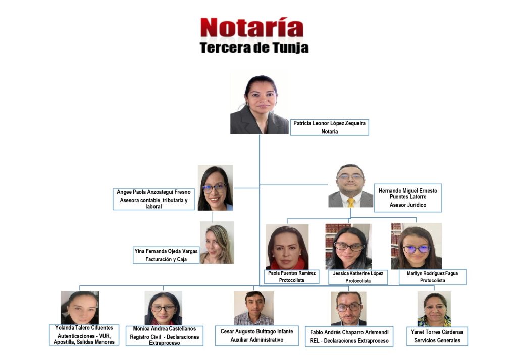 Los funcionarios de la Notaría Tercera de Tunja, que conforman el equipo de trabajo y apoyan la labor de la notaria, cuentan con excelentes relaciones interpersonales y alto nivel de compromiso y profesionalismo para atender las necesidades de los usuarios.